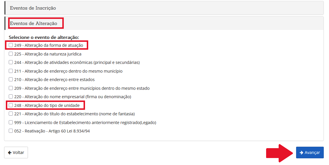 Na próxima tela, você deverá indicar a Forma de Atuação/Tipo de Unidade desejada para a empresa após a alteração.