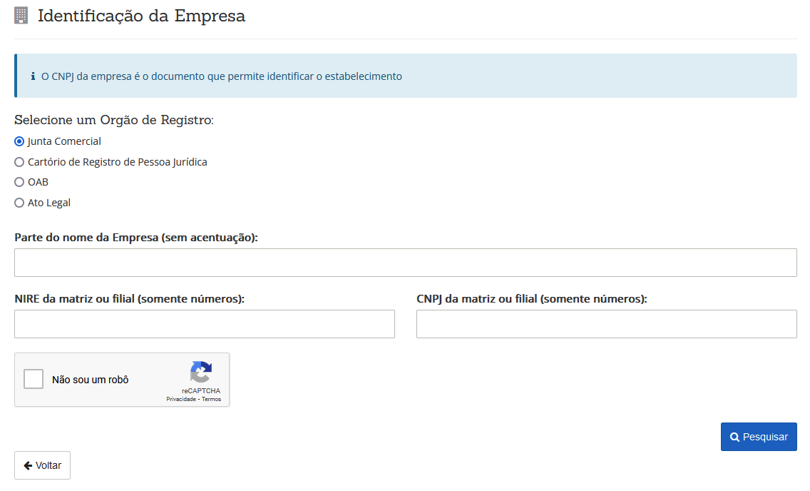 Na tela seguinte será a "Identificação da Empresa", escolha o órgão atual da empresa e preencha apenas 1 campo para pesquisa e clique em avançar.